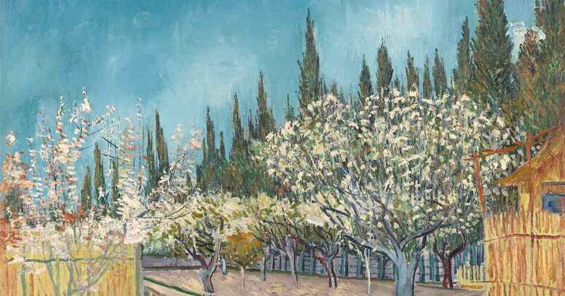 Image: Vincent van Gogh, Dutch 1853–90, Orchard bordered by cypresses, April 1888, Arles, oil on canvas 64.9 x 81.2 cm, Kröller-Müller Museum, Otterlo, © Collection Kröller-Müller Museum, Otterlo, the Netherlands.